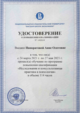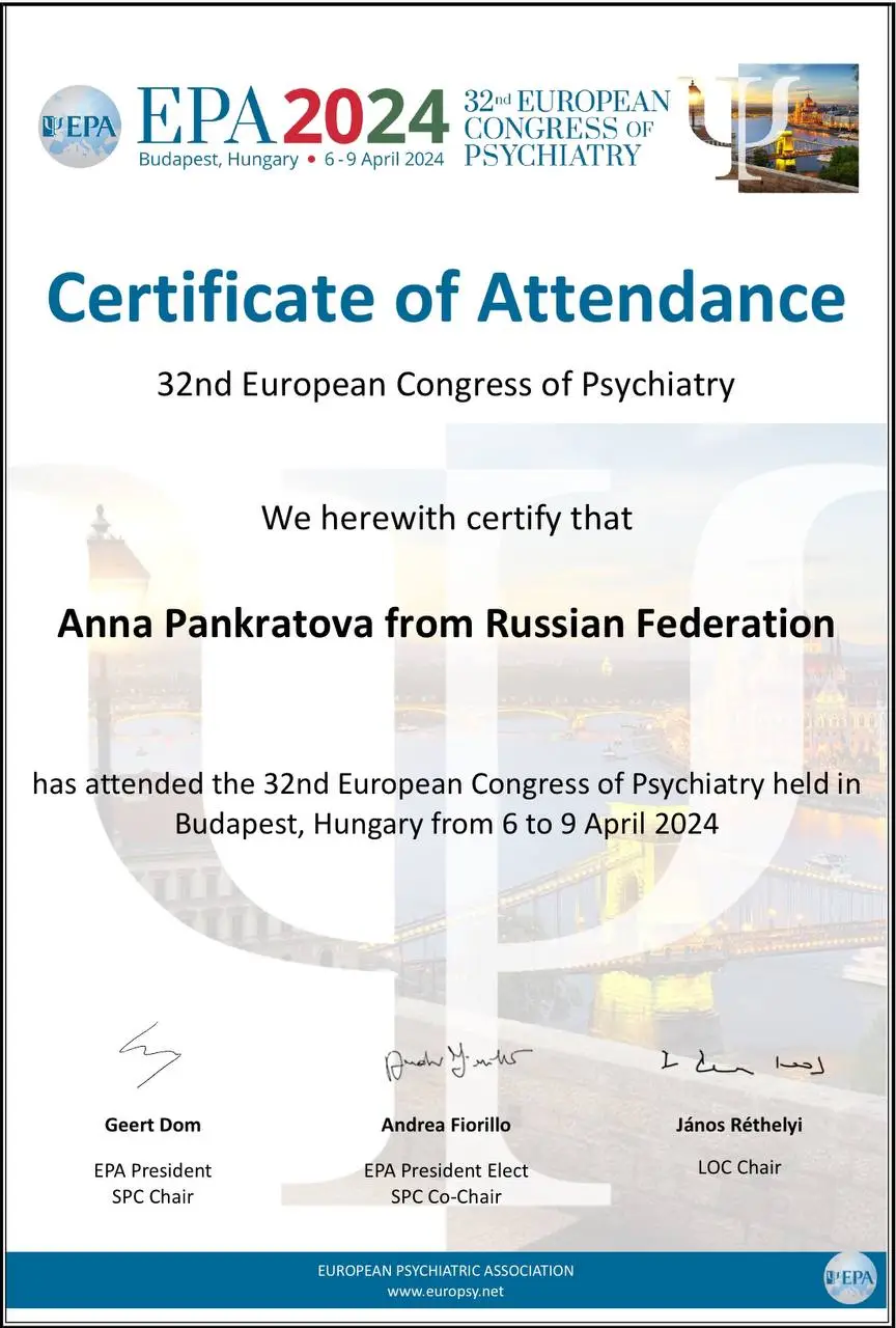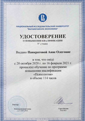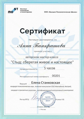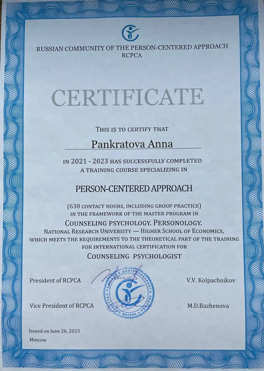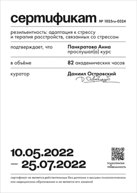 Имею сертификаты о прохождении интенсивов и мастер-классов И. Ялома, Е. Станковской, работе со стрессом, резилиентностью, оказанию первой психологической помощи, теории самодетерминации и др.