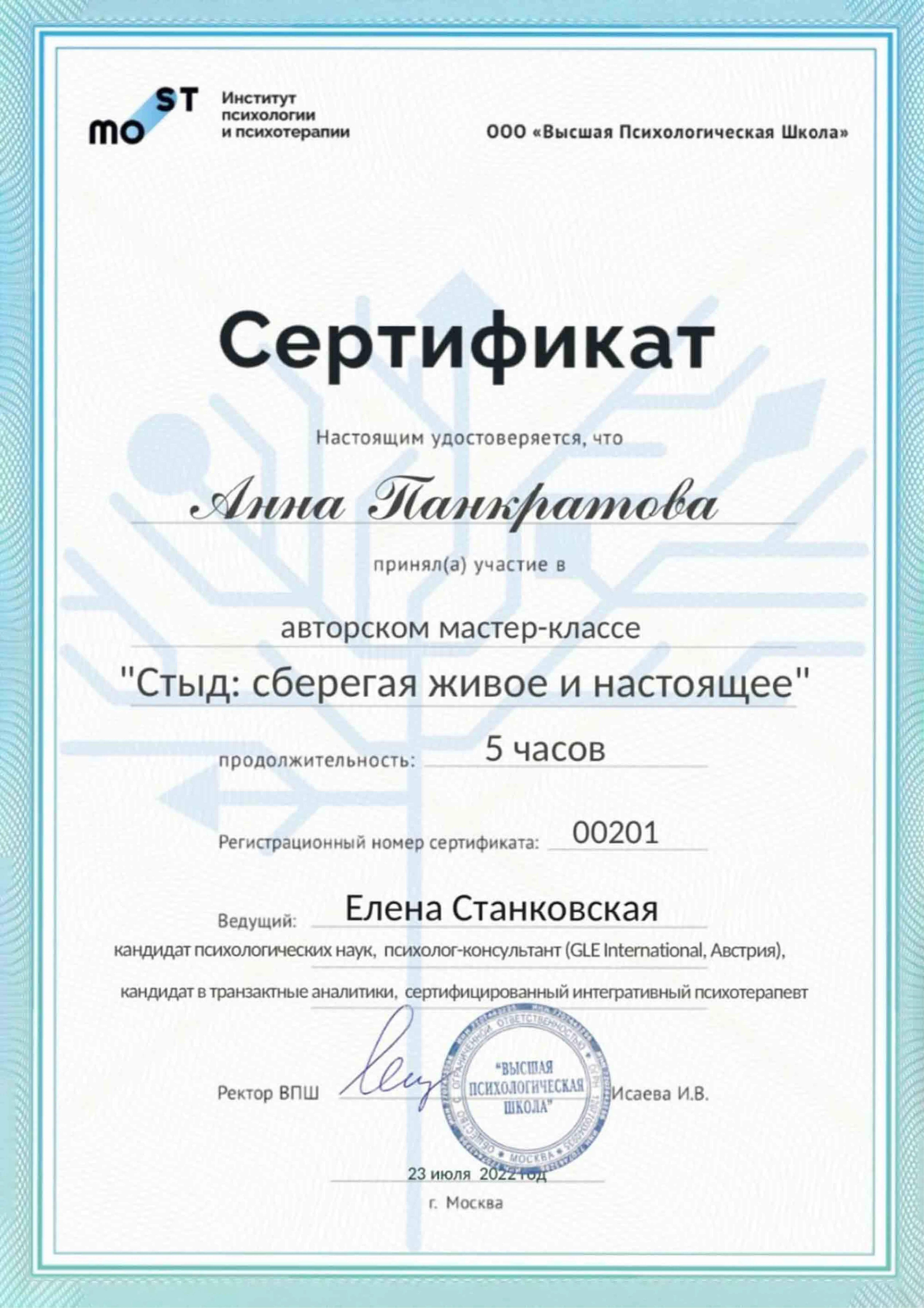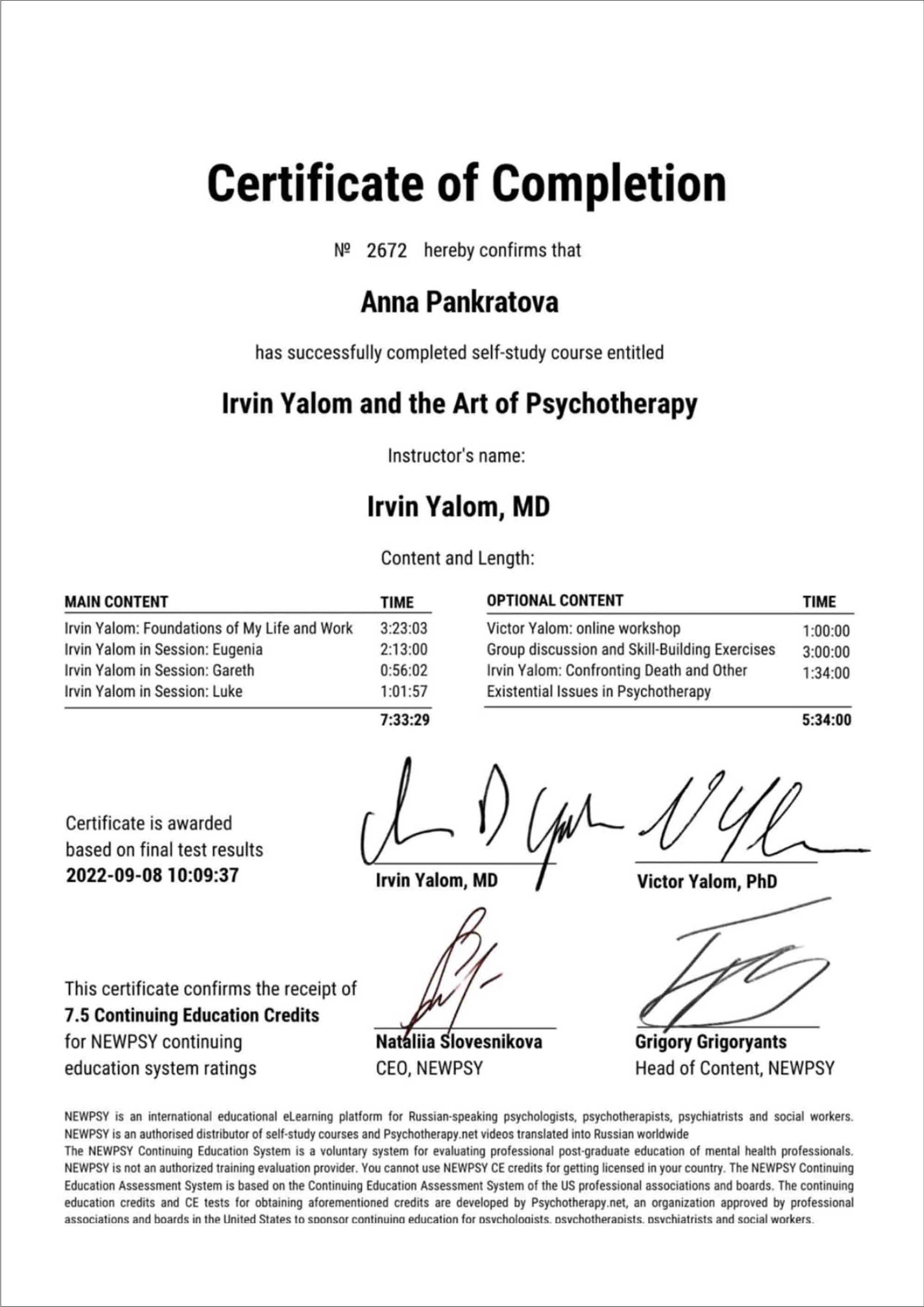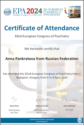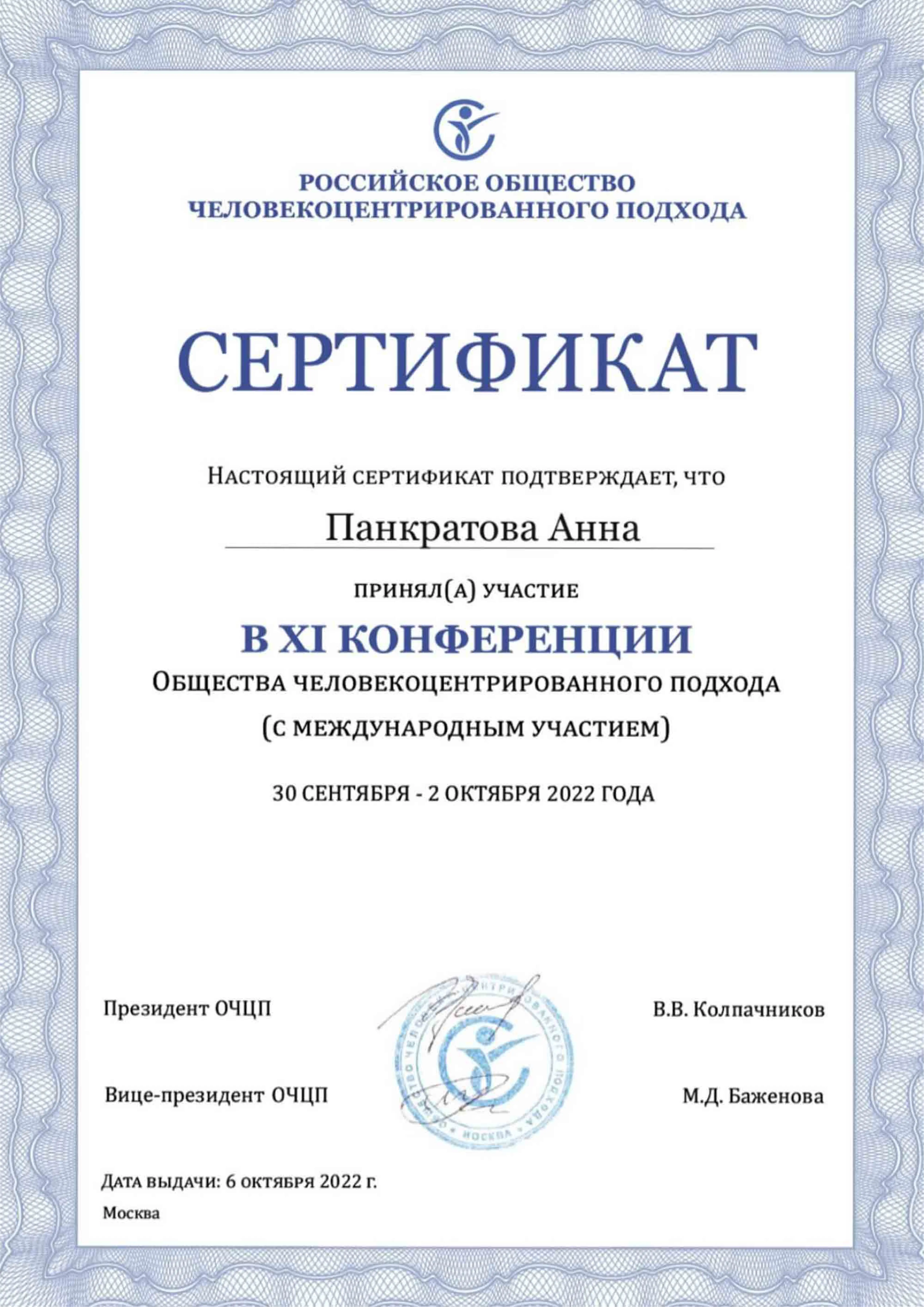 Имею сертификаты о прохождении интенсивов и мастер-классов И. Ялома, Е. Станковской, работе со стрессом, резилиентностью, оказанию первой психологической помощи, теории самодетерминации и др.